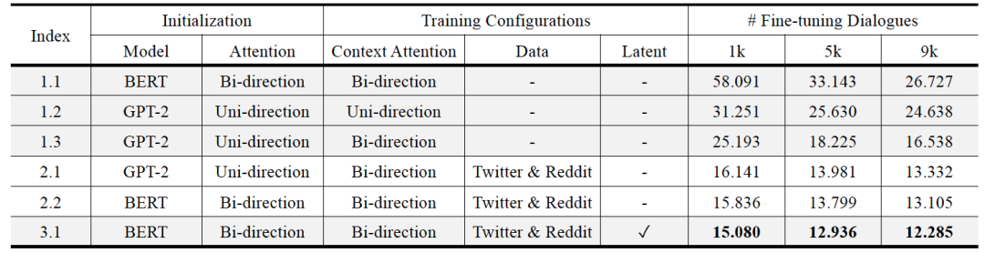 为了解决第一个问题,PLATO在通用预训练模型BERT的基础上进行了较大规模对话领域数据(Twitter & Reddit ~8.3M)的二次预训练,并且在下游特定种类的对话数据上进行了微调。其中,领域二次预训练起到了关键作用。
