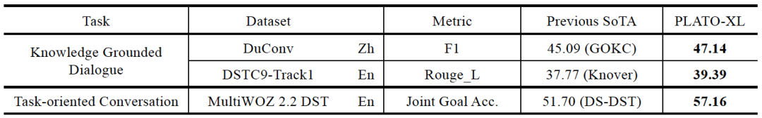 整体上,PLATO的二次领域数据预训练手法和离散隐变量解决回复多样性的问题在当时是比较先进的,在闲聊、对话式问答等多个数据集上达到了当时的领先水平,并且很好的展示了解决对话多样性的能力。