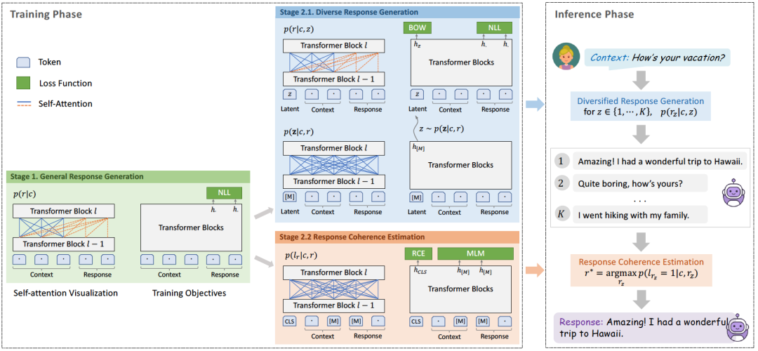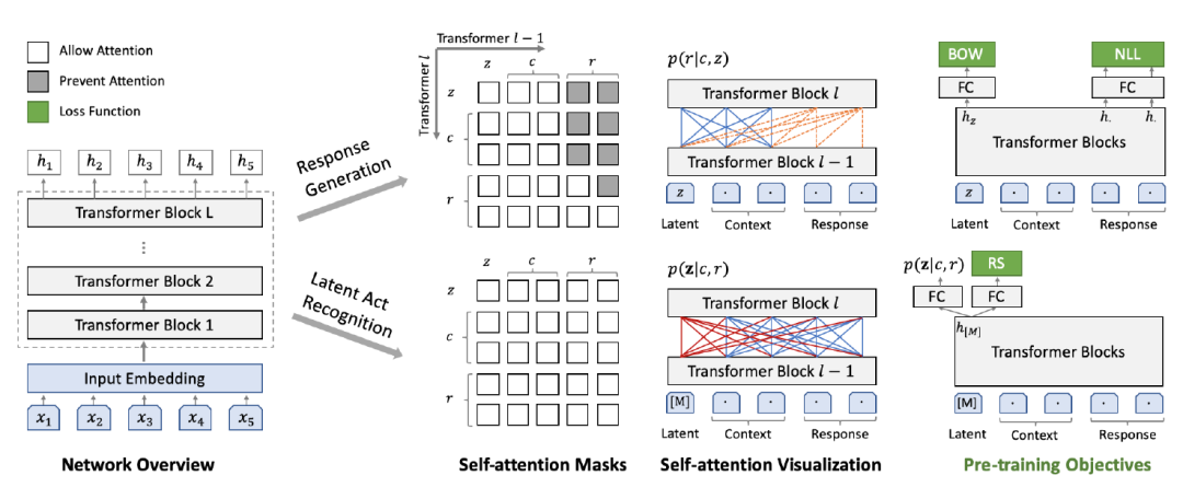 在模型结构上,PLATO借鉴了UniLM[1]:对上文进行了双向编码,充分利用和理解上文信息;对回复进行单向解码,适应回复生成的自回归特性。
