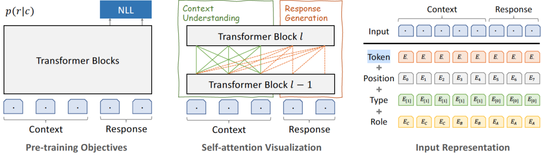 这是一种纯简Transform结构,对话上下文双向编码,回复单向生成,只保留了负对数似然作为文本生成的预训练目标。Token编码+位置编码+类型编码+多轮对话角色编码组成输入也是经典搭配。