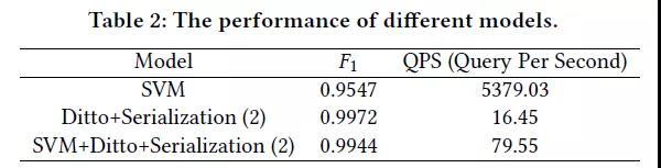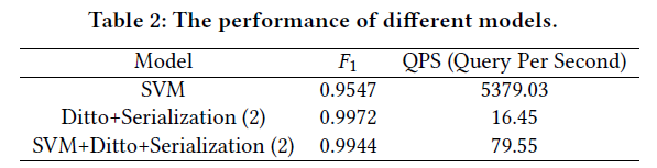 除了在序列化上的改进以外,论文中的系统还使用了一些剪枝策略来加速匹配的过程。首先,基于字符串相似度过滤一部分待匹配实体对;其次,使用SVM模型进行匹配;最后,将SVM匹配置信度不高的样本交由Ditto进行匹配。实验结果如下表所示: