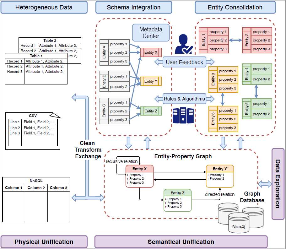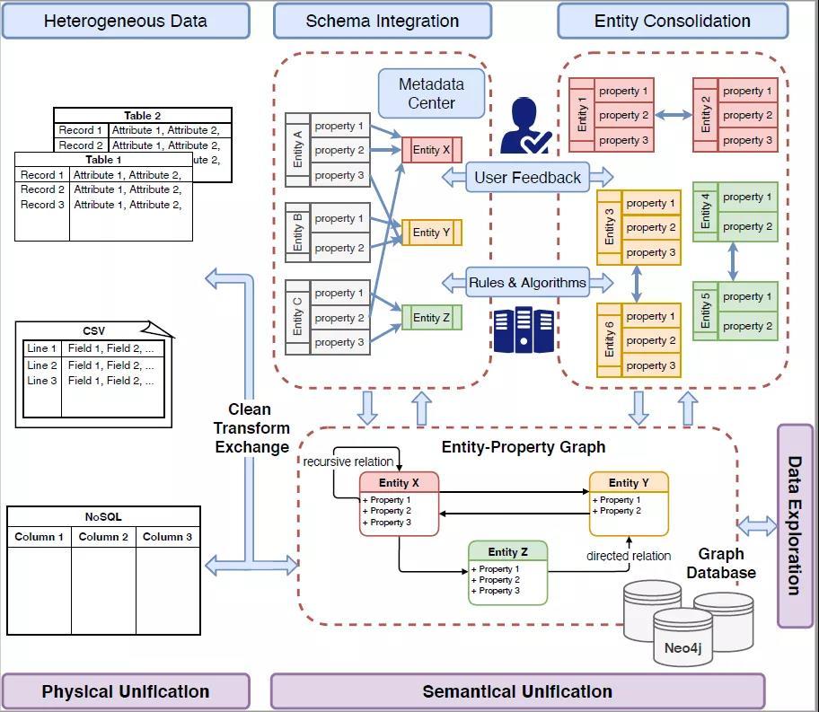 因此,作者团队提出了基于图数据模型的异构数据集成系统HAO Unity,尝试从图数据模型的角度提供异构数据集成的解决方案。该系统从“物理”和“语义”两个方面来统一异构数据,其中“物理”是指从格式上统一,“语义”则意味则将语义相同的实体进行统一,这两部分也称为schema integration和entity consolidation。本文的主要贡献包含: