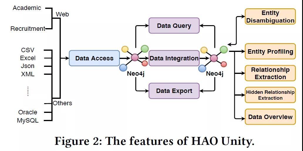 HAO Unity提供10项具体的功能,包括:数据导入、数据集成、实体消歧、实体分析、关系抽取、隐含关系抽取、数据概览、数据查询、数据导出和系统介绍。如上图所示,用户可以从多种数据源导入数据,然后导入的数据会被转换为neo4j中的属性图。接下来,用户可以通过SQL-like的方式进行数据查询,或者将数据集成至其他数据源,又或者直接导出数据为其他格式。数据集成后,用户能够以不同的粒度对统一的属性图进行查询。