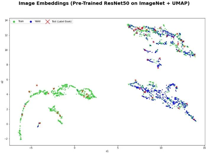 从图像中提取特征的一件很酷的事情是,我们可以使用 UMAP 在 2D 中将它们可视化,以更好地理解训练和验证集的特征空间。在下面的可视化中,我们可以看到,有趣的是,给定的训练数据分布与给定的验证数据不匹配。在特征空间的左下角有一个区域我们没有验证图像。这表明,在运行上面的“数据增强”过程之前,可以尝试重新调整训练和验证数据分割。