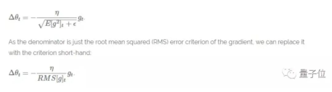 与之前无效地存储w先前的平方梯度不同,梯度的和被递归地定义为所有先前平方梯度的衰减平均值。作为与动量项相似的分数γ,在t时刻的滑动平均值Eg²仅仅取决于先前的平均值和当前梯度值。