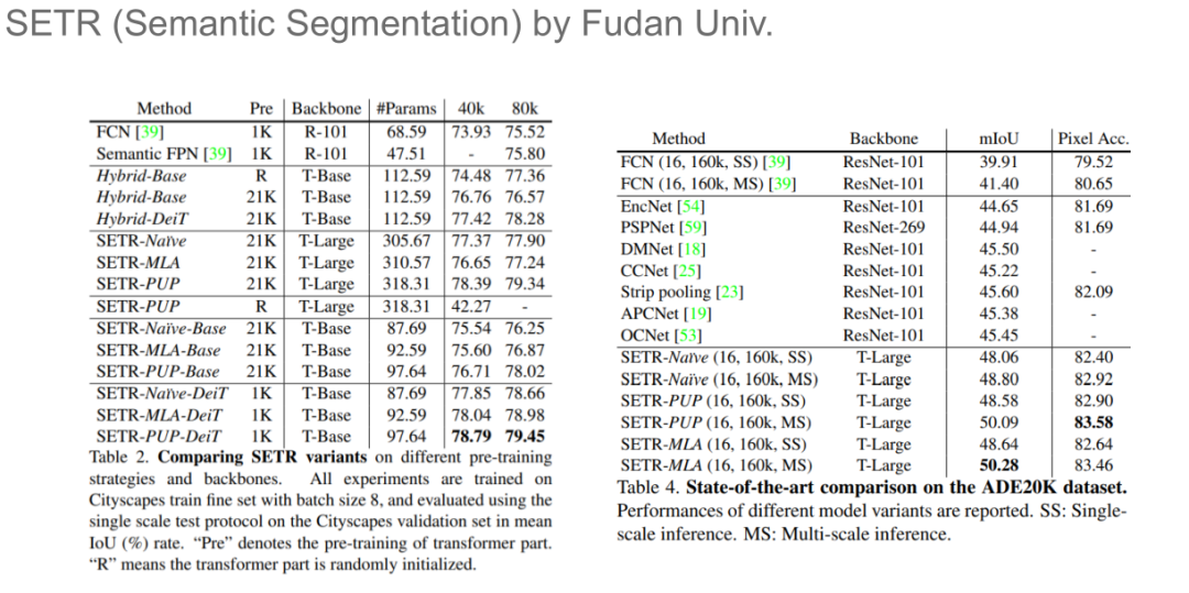 实验结果表明,使用 ImageNet 21K 中的大量数据预训练的 SETR 模型可以在 ADE20K 数据集上取得超过 50% 的 mIoU,大幅优于基于 ResNet 的模型的性能。