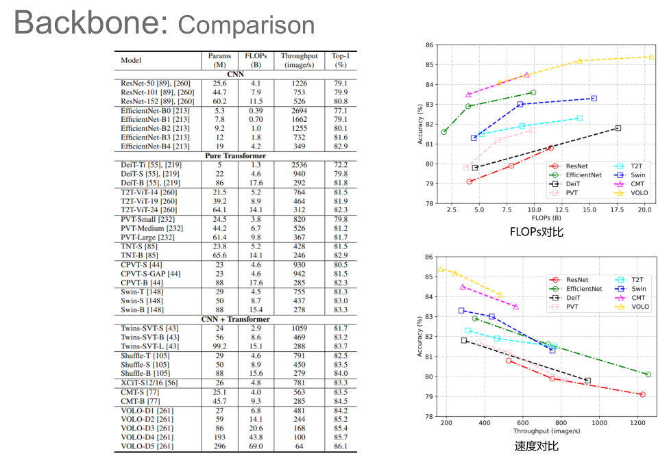华为诺亚方舟实验室对 CNN 模型、纯 Transformer 模型、CNN+Transformer 模型的运算效率进行了对比。实验结果表明,在相同的实验环境下,纯 Transformer 架构的 FLOPs 处于 ResNet 和 EfficientNet 之间。目前最优的模型是 CMT、VOLO 等将 CNN 与 Transformer 相结合的模型。