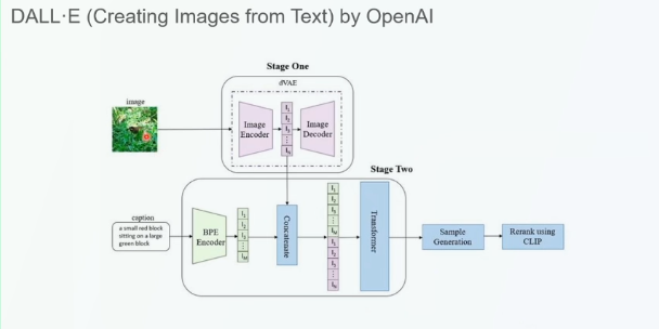 OpenAI 在 CLIP 的基础上进一步推出了可以根据文本生成图像的 DALL-E 模型,该模型可以「理解」输入文本的抽象含义,并以此生成生动的图像。在第一阶段,我们首先训练一个编码图像的编码-解码结构,并将中间表示作为图像特征。在第二阶段,我们提取文本的特征,并将其与图像特征拼接起来,从而得到图文对的特征。接着,我们通过 Transformer 模型生成图像。最后,我们通过 CLIP 模型重新对生成的图像排序,将排序最高的图像作为最终的输出。