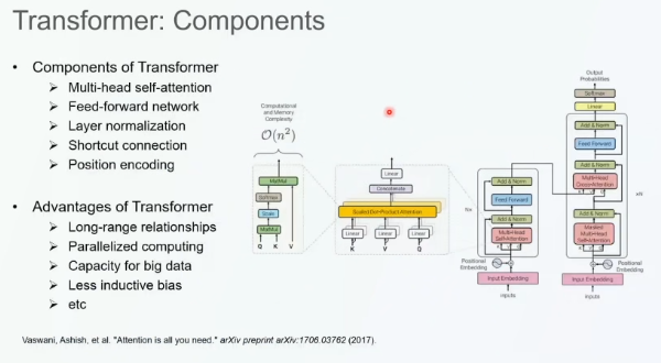 Transformer 包含多头自注意力机制、前馈神经网络、层归一化、Shortcut 连接、位置编码等组件。其中,最核心的部分为多头自注意力机制,它通过线性变换将输入转化为 Q(Query)、K(Key)、V(Value)矩阵。接着,我们通过 Q 和 K 的内积计算二者之间的相关性,再将相关性与 V 相乘得到修正后的 Token 表征作为多头自注意力的输出。