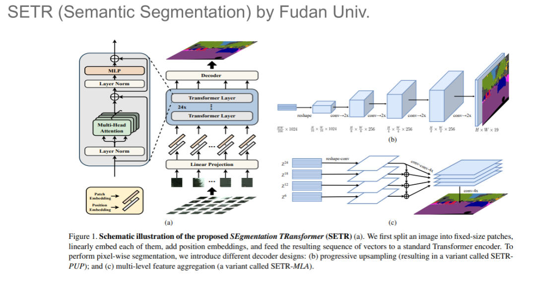 复旦大学提出了 SETR,将 Transformer 模型用于语义分割任务。该模型首先将图像划分为若干个 Patch,并将其输入给 Transformer 编码-解码结构,并通过少量的卷积层输出最终的分割结果。