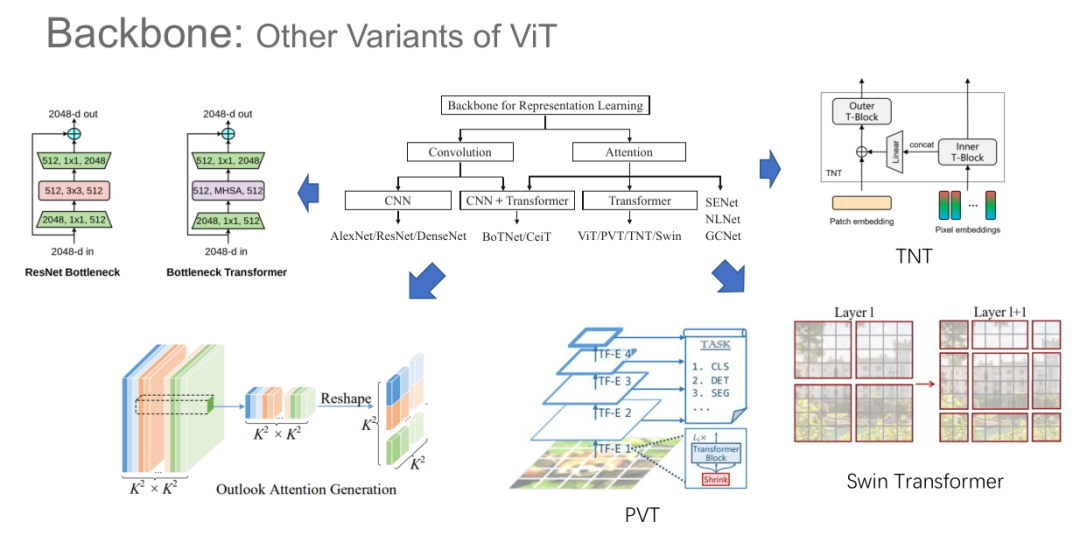 受 ViT 的启发,研究人员提出了一系列基于 Transformer 的视觉模型。具体而言,用于表征学习的骨干模型可以分类基于卷积的模型和基于注意力机制的模型。其中,基于注意力机制的模型又分为基于自注意力机制的 Transformer 模型和基于其它注意力机制的模型(如 SENet、NLNet、GCNet等)。基于自注意力机制的模型分为基于纯粹的 Transformer 架构的模型(例如,ViT、PVT、TNT、Swin),以及将 CNN 与 Transformer 相结合的模型(例如,BoTNet、CeiT)。