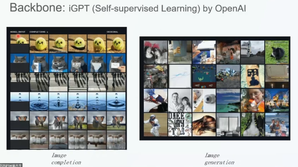 如图 x 所示,在图像填充任务中,给定图像上半部分,我们通过 iGPT 图像预测图像的下半部分,得到的图像语义上与上半部分具有一致性;在图像生成任务中,iGPT 模型生成的图像质量可以比肩 GAN 等模型。