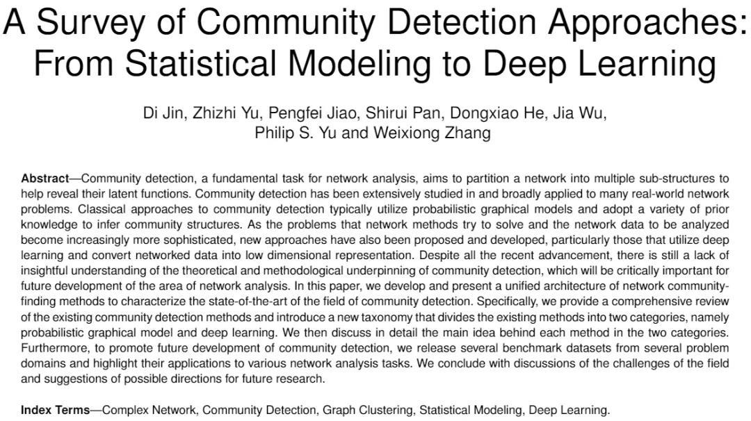 本文是来自天津大学图机器学习与数据挖掘团队,联合莫纳什大学、麦考瑞大学,以及圣路易斯华盛顿大学 AI 权威 Weixiong Zhang 教授、UIC 数据挖掘权威 Philip S. Yu 教授等对网络社团发现领域的最新综述,首次以「从统计建模到深度学习」的新视角,为现代网络数据社团发现领域描绘出一幅宏伟而全面的蓝图。