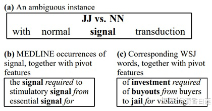 这句话里面的 “signal” 在此处是名词,但如果词性标注模型是用 WSJ 语料训练的,会将其错误的识别为形容词。对比 MEDLINE 语料中 signal 这个词的上下文与 WSJ 语料中名词的上下文,可以发现一些共同的 Pattern,比如都出现在 required、from 与 for 这些词前面,因此可以用这些共同的 Pattern 作为 Feature,训练的模型就可以获得很好的跨领域泛化能力。这些 Pattern 就是 Pivot Feature。