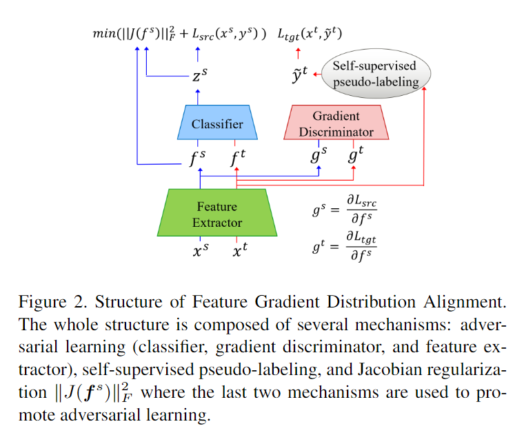 本文提出了 FGDA 方法,如下图所示,该算法通过特征提取器和鉴别器之间的对抗学习来减小特征梯度在两个域之间的分布差异。当达到平衡时,特征分布差异的值是最小的。