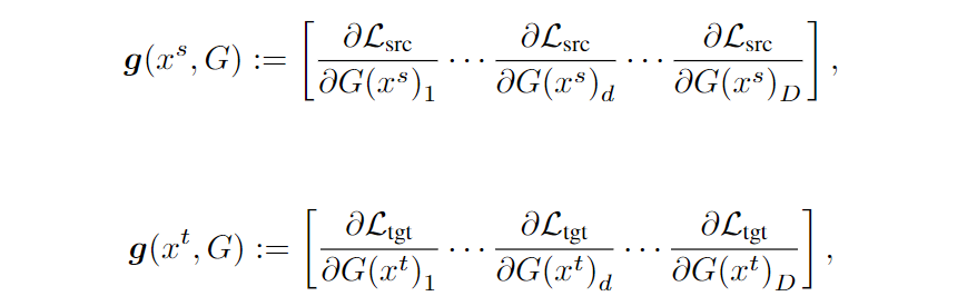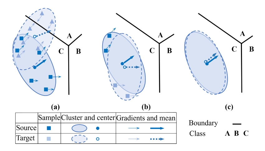 文中依然是使用了对抗学习来,具体来说,鉴别器预测源域和目标域特征梯度的域标签,而特征提取器学习混淆鉴别器。当达到均衡时,特征分布差异达到最小值。