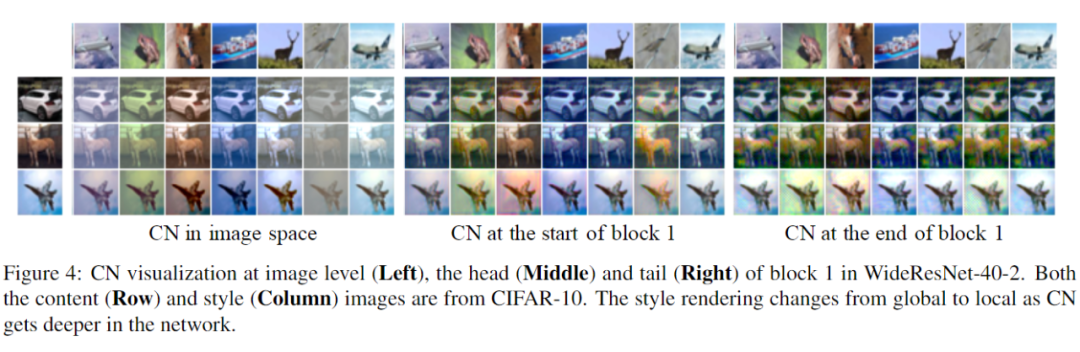 我们来看看文章的可视化结果。随着 CN 在网络中的深入,风格的变化变得更加局部和微妙。