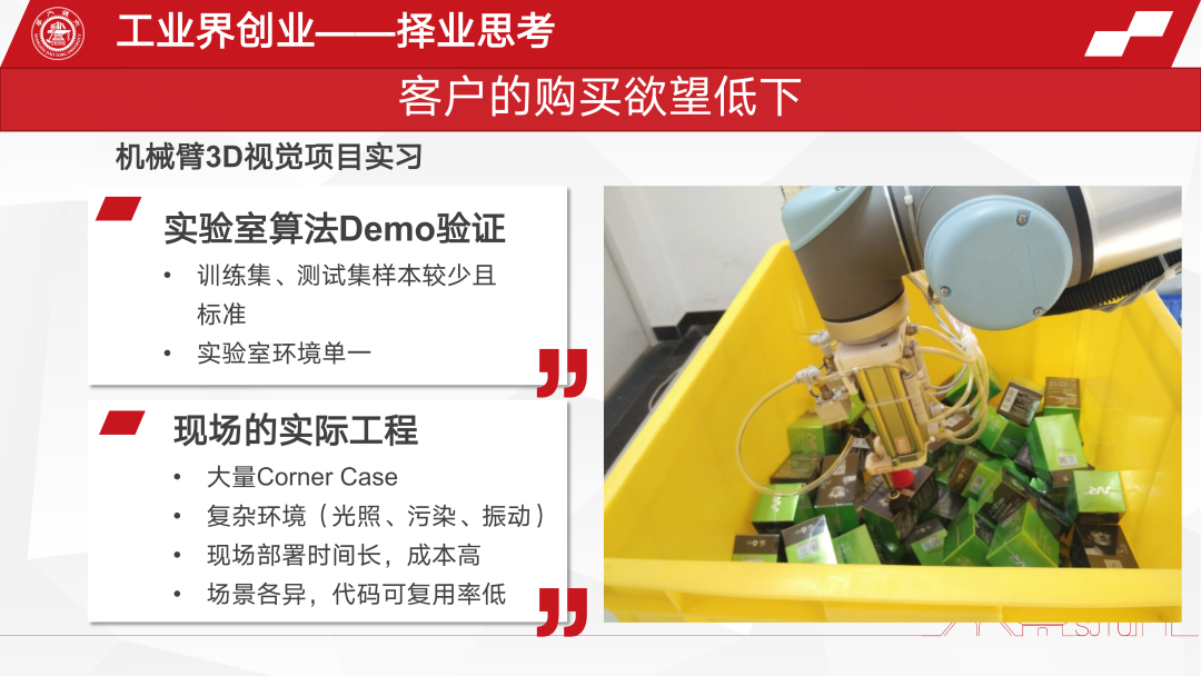 所以当时我就做了一个很深刻的检讨,机器人+工业界+创业+ AI 的这条路是不是行得通?AI 是不是真的有市场。