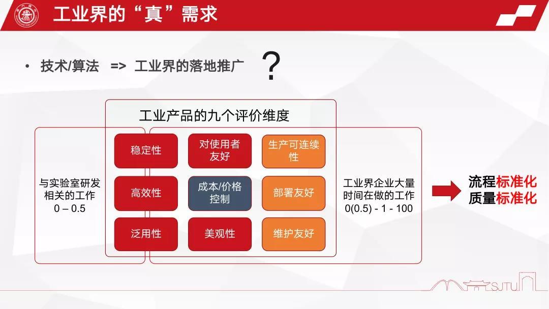 我们要做什么事情,才能够把一个好的技术算法在工业界推广?我觉得其实是学术界和工业界,考评的指标不太一样。我们简单来看一下这张图。