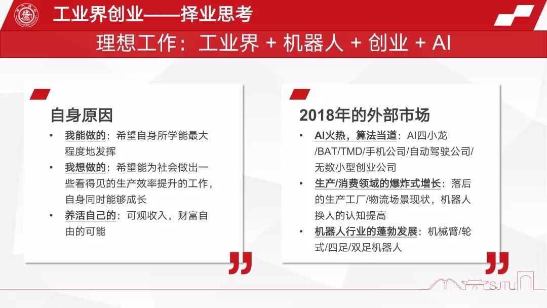 对我自己来说,我能做什么?我从 2011 年学到2018 年学了很久的机械机器人,不希望把这些东西全部丢掉,然后转做一个写代码的人。我也并不觉得我跟计算机本专业毕业的这些人比,在竞争优势上我会比他们强多少,因为毕竟时间短。第二个我想做的,其实更多的是希望能够为社会做出一些看得见的效率提升,同时我希望在做这个事情中自己能够成长。最后一个就是养活自己的,需要有个比较可观的收入,最好能有一个财富自由的机会。结合这三点话,我把自己的工作定位在了工业界+机器人。