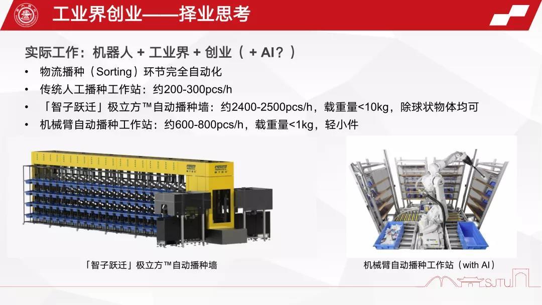 我当时问了自己一个问题,说如果我是客户,我会选 A 产品——我们公司做的播种墙,还是选机械臂?我当时觉得自己会选我们的播种墙。所以我当时就决定去我们公司创业,而且把 AI 暂时从我们这边去掉。事实证明我的选择是对的,因为在 19 年把我们公司的产品第一次推向市场,在展会上亮相的时候,我还能看得到有很多公司将机械臂工作站作为方案在展会上亮相,但到了今年第三年了,这些公司都不再做这个方案了,因为他们知道打不过我们,这个方案在商业上不可行。