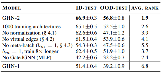 利用计算图的结构是 GHN 的一个关键特性,当用 MLP 替换 GHN-2 的 GatedGNN 时,在 ID(甚至在 OOD)架构上的准确率从 66.9% 下降到 42.2%。