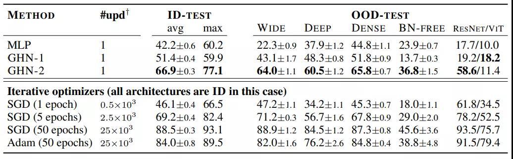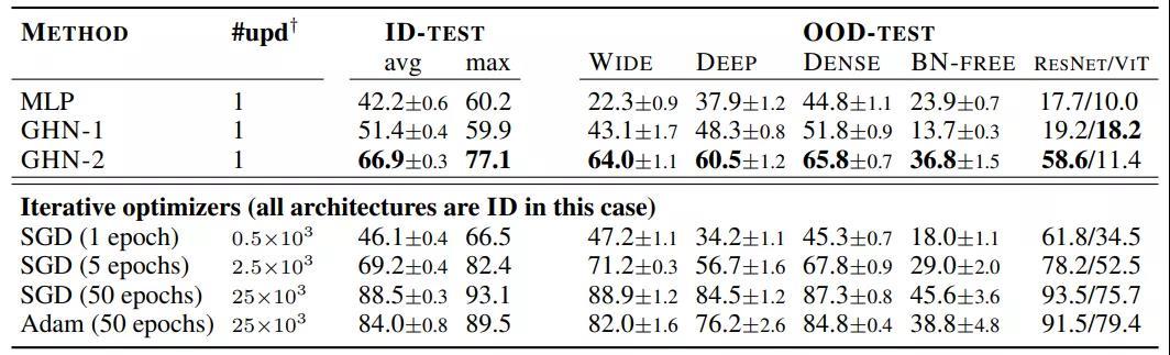 表 3:GHN-2在DEEPNETS-1M 的未见过 ID 和 OOD 架构的预测参数结果(CIFAR-10 )