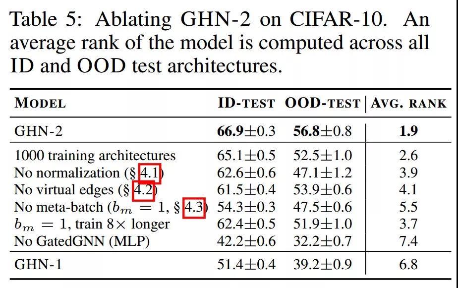 表 5:在 CIFAR-10 上消融 GHN-2,在所有 ID 和 OOD 测试架构中计算模型的平均排名