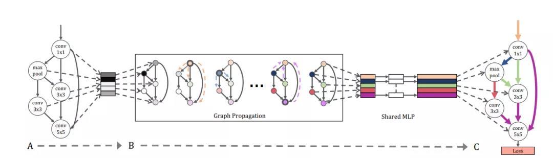 图 0:GHN原始架构概览。A:随机采样一个神经网络架构,生成一个GHN。B:经过图传播后,GHN 中的每个节点都会生成自己的权重参数。C:通过训练GHN,最小化带有生成权重的采样网络的训练损失。根据生成网络的性能进行排序。来源:https://arxiv.org/abs/1810.05749