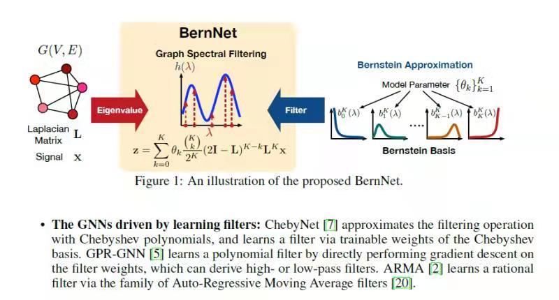 文章导读:现有的工作中,图谱滤波器需要认为预定义,或者在没有约束的情况下直接学习,这可能导致滤波器过于简化或者缺少可解释性。本文提出基于Bernstein多项式的BerNet。这种方法使用K阶Bernstein多项式逼近图在归一化拉普拉斯谱上的任何滤波器。