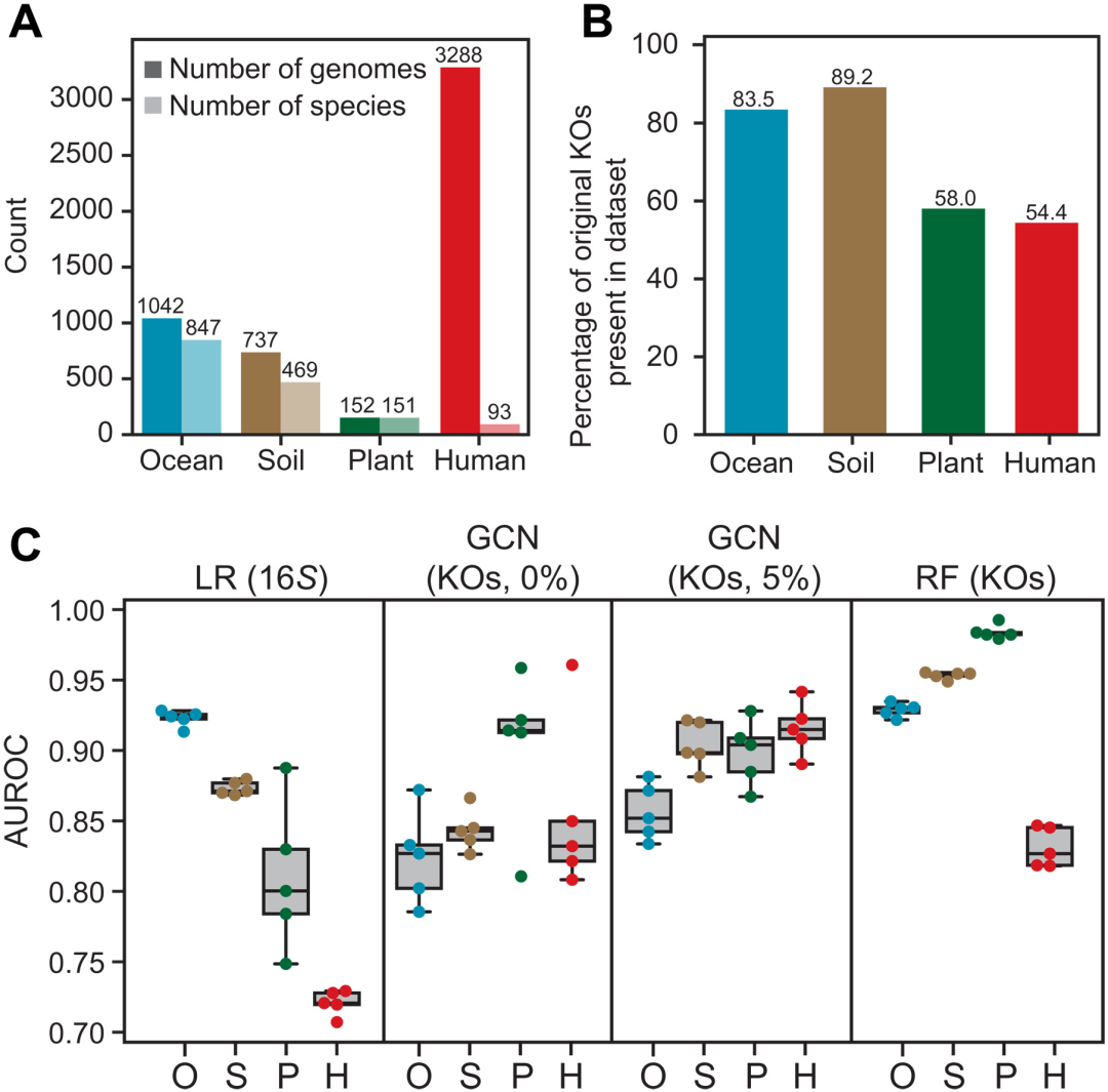 鉴于选择可能在不同的空间尺度上起作用,包括在单个宿主的水平上,研究人员试图确定该方法是否对来自单个环境或由单个实验室或联盟生产的相对较小的数据集内的 HGT 预测有效 ,其中移动遗传元件的分散,而不是选择,可能会支配信号。研究人员确定了来自各种环境 [海洋、土壤、植物根和人体肠道] 的四个正交分离物数据集,并应用于在 12,000 多个分离物上构建的原始模型,来预测 HGT。海洋数据集包含 847 个物种,而人类肠道数据集包含 3288 个高质量基因组,尽管仅代表 93 个物种。