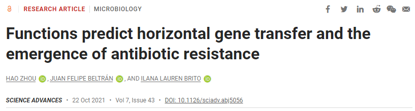该研究以「Functions predict horizontal gene transfer and the emergence of antibiotic resistance」为题,于 2021 年 10 月 22 日发布在《Science Advances》。