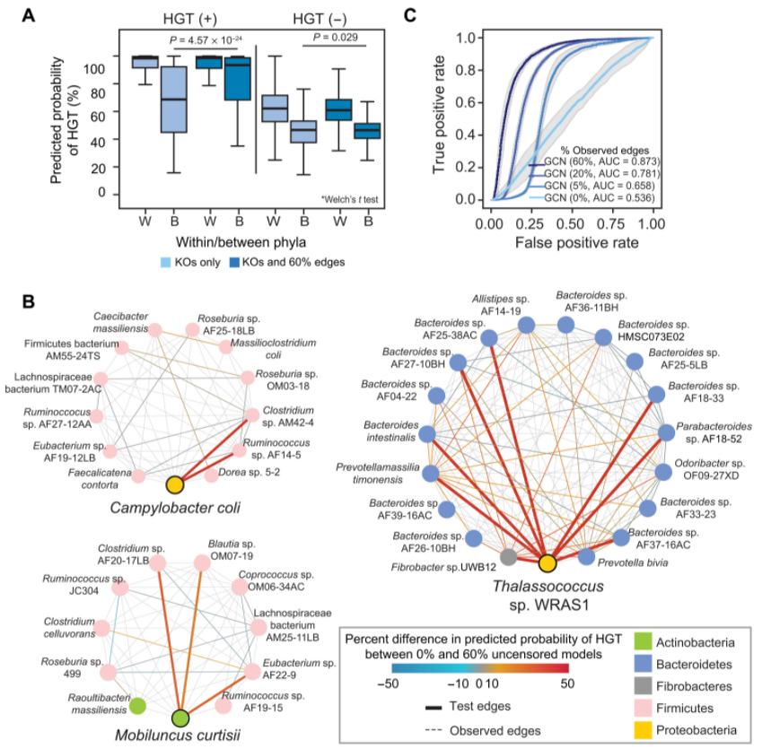 鉴于这种性能,研究人员检查了测试数据中的稀有边缘(23,545 个边缘中的 46 个,或 0.2%),这些边缘实现了 ARG-HGT 的高预测概率(超过 0.9),但没有检测到转移。这些边缘几乎是厚壁菌门、拟杆菌门和放线菌门的人类相关肠道和口腔微生物组成员所独有的;涉及几种病原体;并且不同于随机排列的 HGT 负边缘样本。