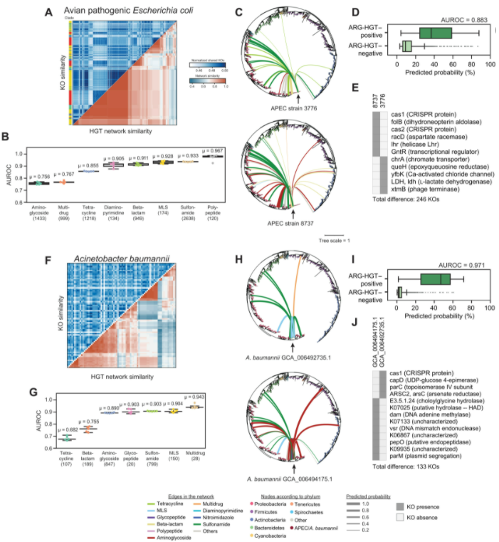 研究人员发现功能性内容准确预测HGT网络,涉及抗生素抗性基因(ARG)的转移的性能进一步提高,突出了HGT机制、生态位特异性和代谢功能的重要性。发现尚未检测到的高概率 ARG 转移事件,几乎是人类相关细菌所独有的。该方法在预测病原体的 HGT 网络方面是可靠的,包括鲍曼不动杆菌和大肠杆菌,以及在局部环境中,例如个人的肠道微生物组。