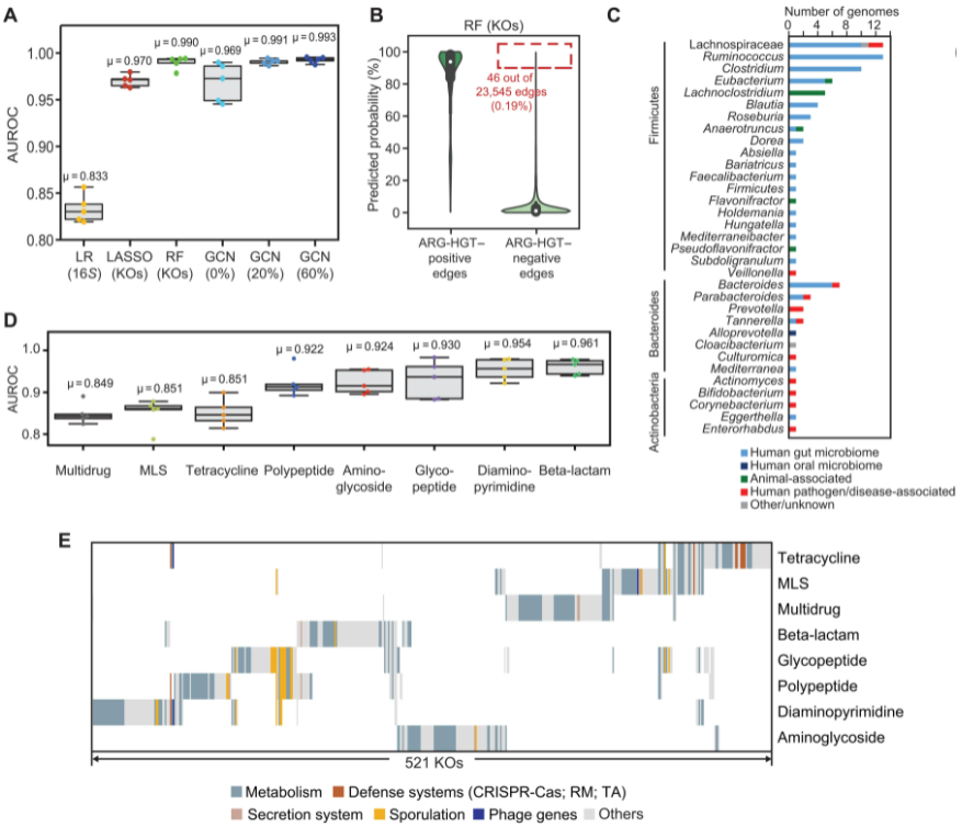 HGT 的模式可以从大规模 HGT 网络中提取。使用机器学习,确定了定义最近 HGT 事件的特定原核功能,深入了解 HGT 各种驱动因素的相对贡献,包括利基特定属性、HGT 的机械障碍以及与转移基因子集相关的特征。研究人员的分析揭示了一系列可能的补偿和适应性功能;这些功能可能使生物体能够适应与基因获取相关的细胞应激,可能在移动遗传元件整合的热点遗传连锁,或涉及每个抗生素类别的ARG的功能或在移动元件上编码的其他功能。