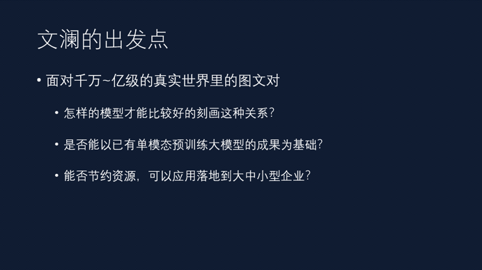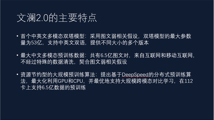首先,我们的文澜2.0应该是首个中英文多模态双塔模型:这里强调双塔,有很重要的一个考虑,就是我们假设我们的图和文之间只有很弱的关系。另外,模型最大参数量也只有50多亿,并不是很大;支持中英文双语,同时我们为了落地也推出了不同大小的多个版本。