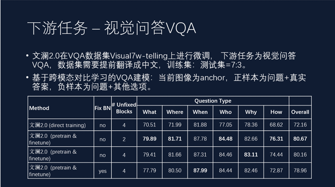 其次,关于训练方式。起初我们很难把DeepSpeed用上,用了好几个月才把它调好。因为它刚出来也不成熟,中间有很多trick。最大的问题就在于它不支持跨模态对比学习,或者说它支持的是很弱的那种,有各种各样的问题,要靠我们去把它调顺。最后我们的预训练用到了6.5亿图文对,用了112张A100的卡,训练一个epoch需要七天左右。