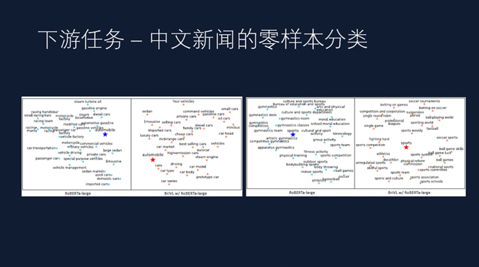 这里也给出了一些可视化的例子(如下图),该图大概的意思就是来尝试解释为什么视觉是有帮助的,刚才可以看到最好的涨点的就是右边的“sports”(运动)的时候,我们把“运动”这个词做了embedding后,可以找出它的近义词,然后用t-SNE画出来,如图所示。这里就可以说明通过多模态训练得到的文本encoder所找到的近义词会比较多样化一些;而如果是纯文本训的话,则会单调一些。
