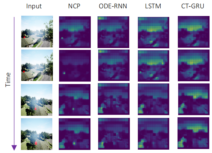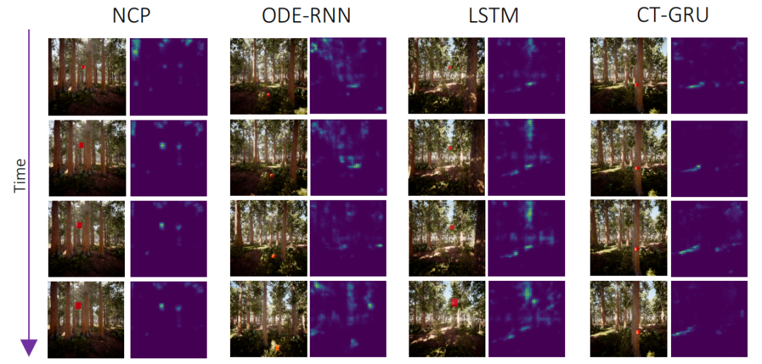 「我们观察到,NCP 是唯一一个在完成导航任务的同时,在不同环境中关注感兴趣对象的网络,无论你在哪里测试,以及在不同的照明或环境条件下。这是唯一可以随意执行此操作并实际学习我们希望系统学习的行为的系统,」Hasani 说。