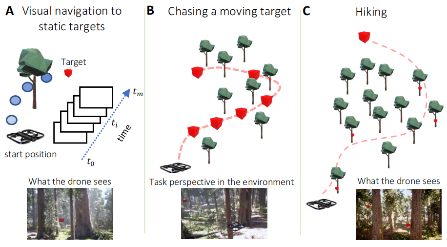 他们通过一系列模拟测试 NCP,其中自主无人机执行导航任务。每架无人机都使用来自单个摄像头的输入进行导航。无人机的任务是前往目标物体、追逐移动目标或在不同环境(包括红杉林和社区)中跟踪一系列标记。他们还在不同的天气条件下旅行,如晴朗的天空、大雨和大雾。