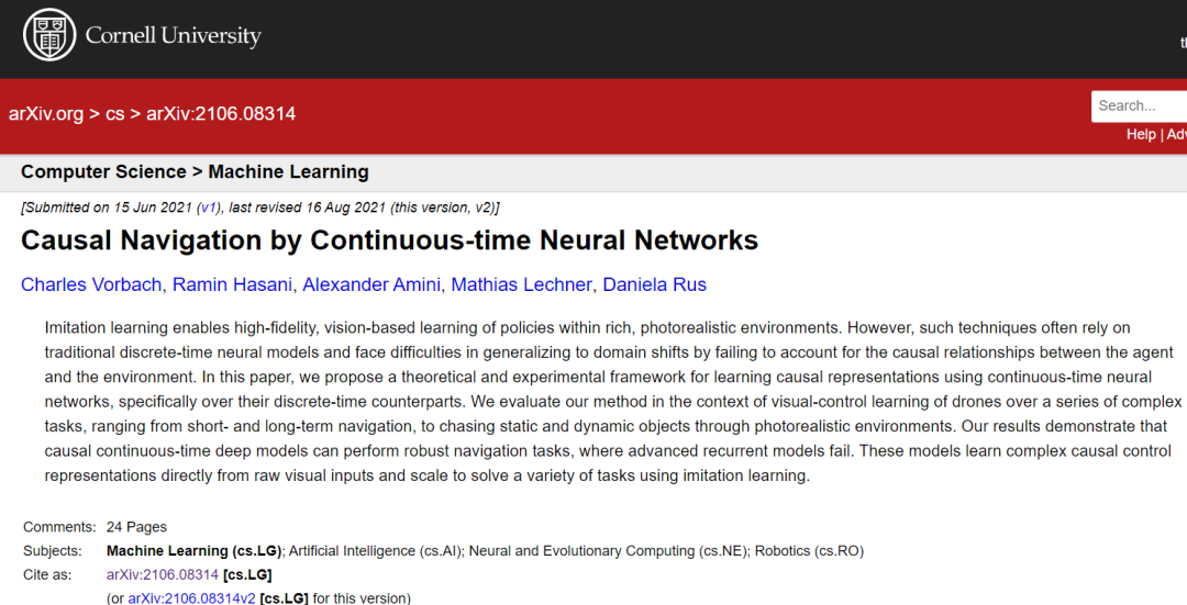 研究成果以「Causal Navigation by Continuous-time Neural Networks」为题发表在预印本平台 arXiv 上。该研究将于今年 12 月在 「2021 年神经信息处理系统会议 (NeurIPS) 」上发表。
