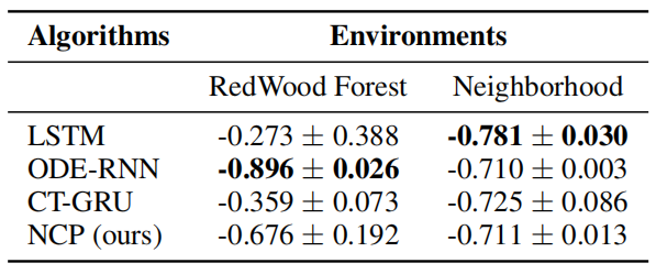 研究人员选择一组基线模型评估 NCP 网络。包括 ODERNNs、长短期记忆网络 (LSTMs) 和 CT-GRU 网络。