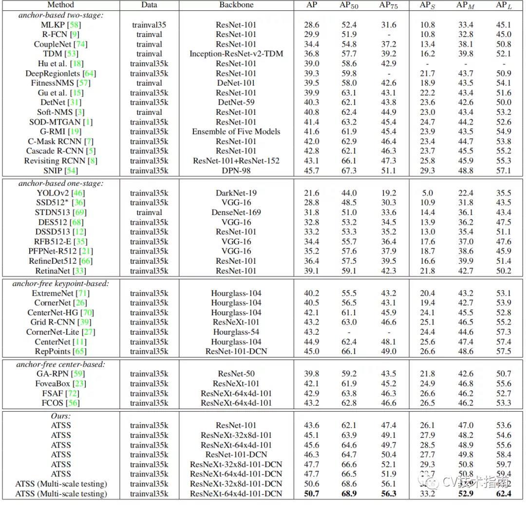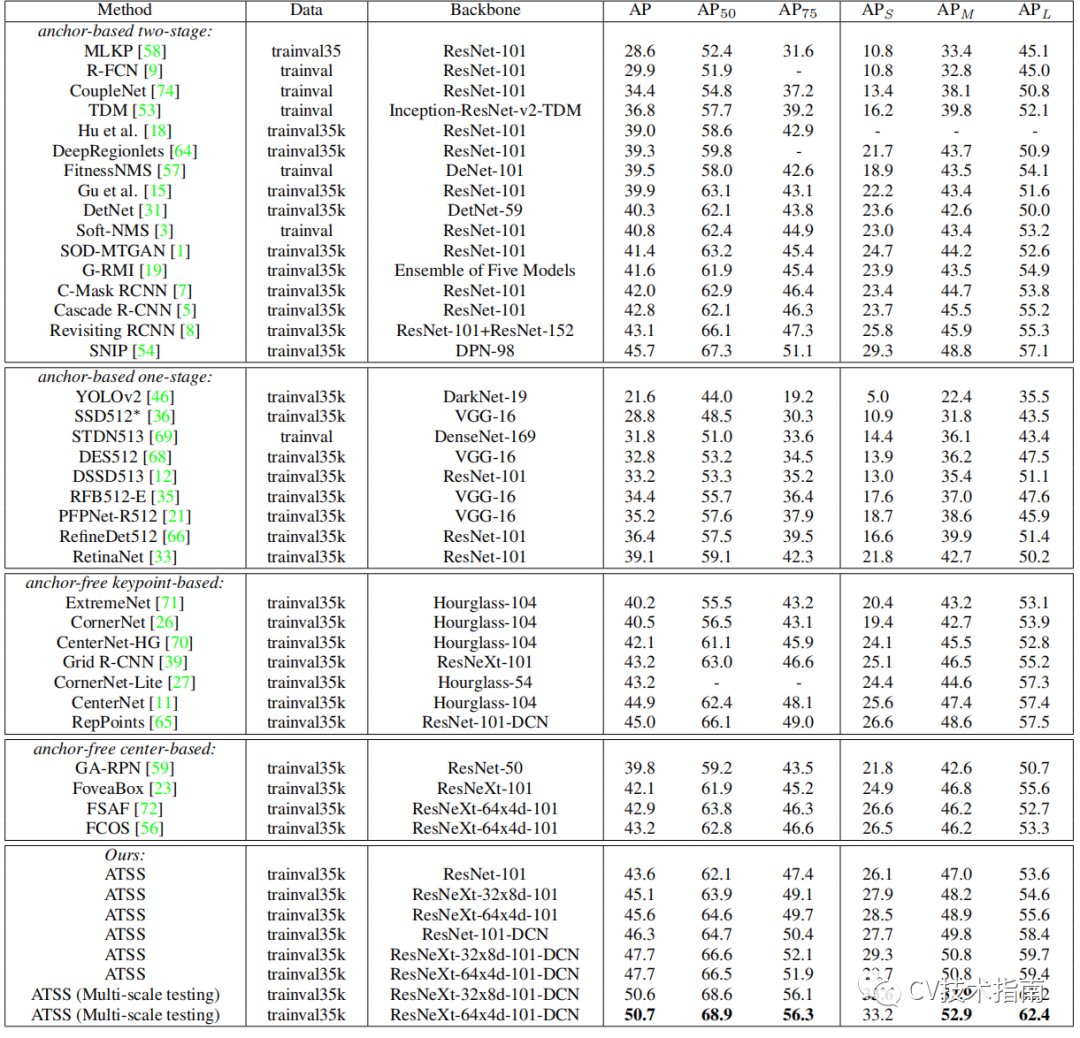 此外,通过一系列在MS COCO数据集上的实验,可以得出结论,不需要在图像上每个位置平铺多个anchors来检测物体。SOTA的 AP 50.7% 是通过应用新引入的 ATSS 而不引入任何开销来实现的。