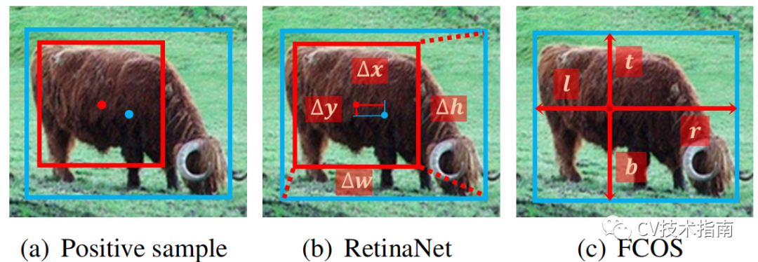 在正负样本确定之后,需要对正样本进行目标位置的回归。如图2所示,RetinaNet回归的是anchor box和ground truth的4个offset,而FCOS回归的是anchor点到4条边的距离。这表明RetinaNet的回归起点是一个框,而FCOS的回归起点是一个点。