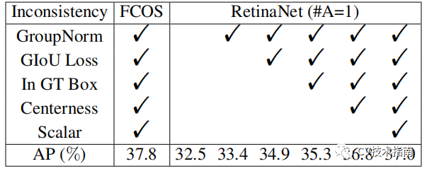 正如 FCOS论文中所报告的,Anchor-free FCOS 的性能比Anchor-based的 RetinaNet 好得多,值得研究这三个差异中的哪一个是性能差距的重要因素。