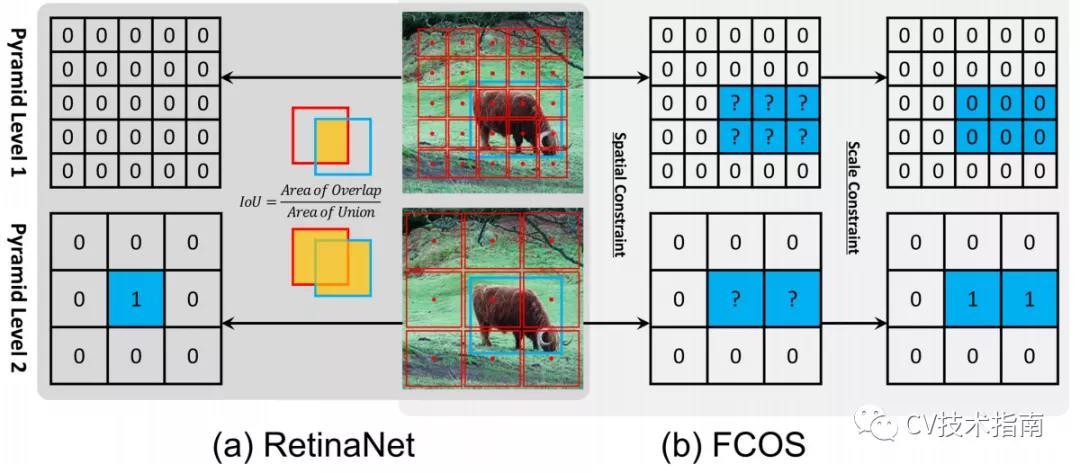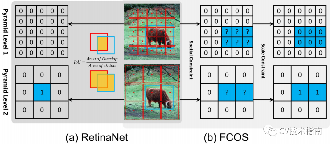 (2) 正负样本的定义。RetinaNet 重新排序IoU用于选择正负样本,而 FCOS 利用空间和尺度约束来选择样本。