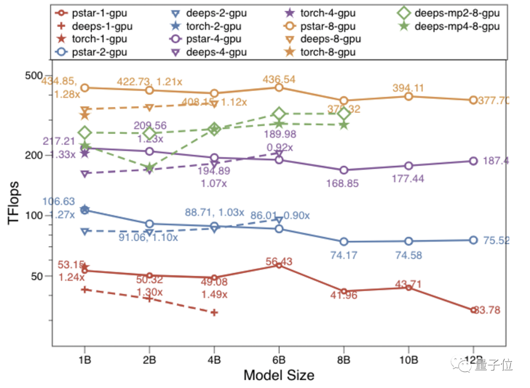(注:圆点周围的值表示派大星在吞吐量及其对DeepSpeed的加速;deeps是DeepSpeed仅使用数据并行的效果,我们接下来称之为DeepSpeed-DP,deeps-mpX 是 DeepSpeed使用X路的模型并行结果;模型的计量单位是B表示十亿Billon。)*