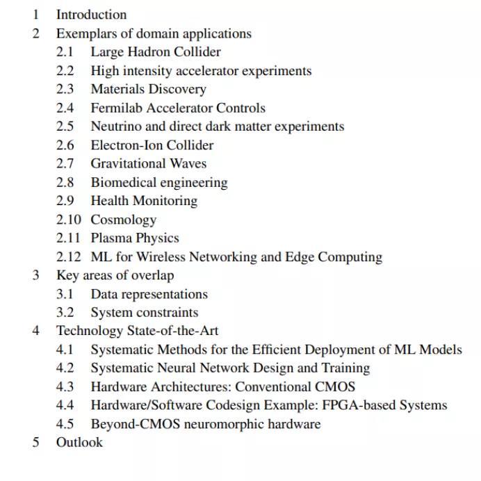 注:这篇综述报告是第二届年度Fast Machine Learning大会的概述,汇集了从粒子物理学家、材料学家到健康监测研究人员,以及机器学习学者和计算机系统架构师等多个科学专家的内容,希望通过专家观点和概念找到特定领域应用、机器学习、实验和计算机系统架构之间汇合点,以加快科学发现。以下是整篇报告的具体章节: