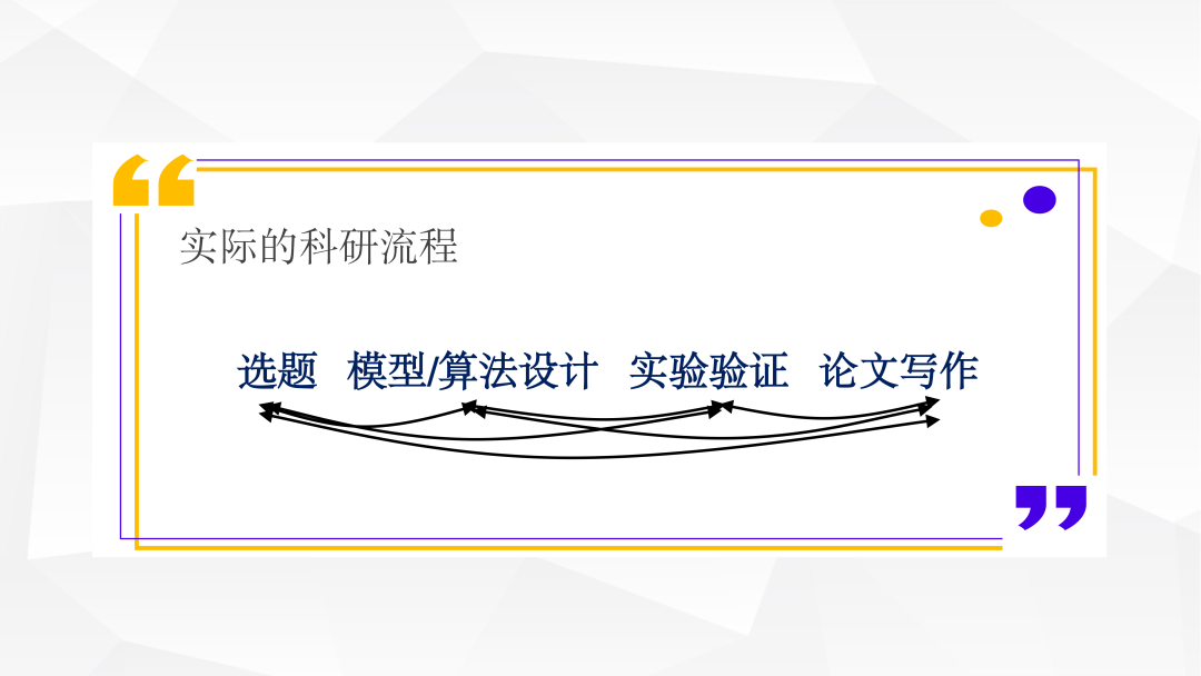 这里我想分享一些科研工作的真实情况。比如像刚刚说的,科研流程有选题、设计算法模型、实验验证、论文写作这四步。但这是理想化的情况,现实里不太可能一次性从头走到尾。一般是做了实验,发现模型不work要去改;或者实验发现这个算法和实验可能行不通,要全部推倒重来,换一个题目;也有可能是论文写了一半,发现要补某个实验,或者说这个模型哪一块不太严谨。这样来回往复,都是有可能的。