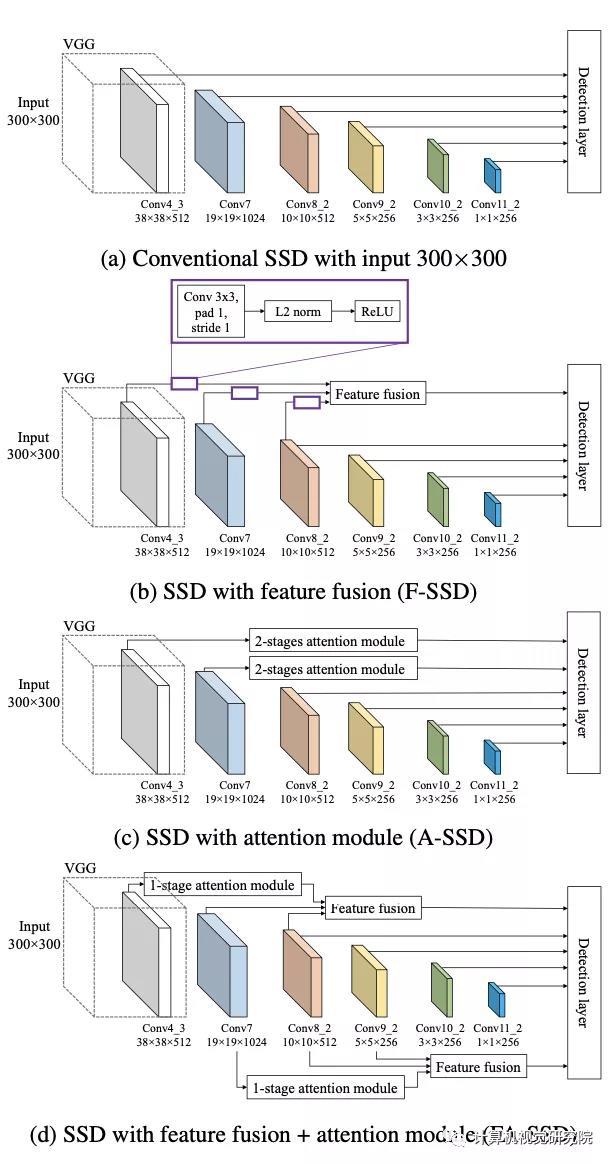 新框架将从基线SSD开始讨论,然后是研究者提出的提高小目标检测精度的组件。首先,SSD与特征融合,以获取上下文信息,名为F-SSD;第二,带有保留模块的SSD,使网络能够关注重要部件,名为A-SSD;第三,研究者结合了特征融合和注意力模块,名为FA-SSD。